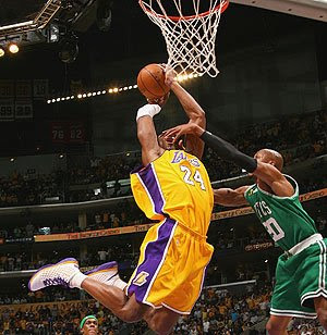 Mais uma vez Kobe foi o centro das atenções e jogou como nunca (ou como sempre). Chamou o jogo, vibrou a todo momento e desde o começo da partida estava com uma cara de quem não ia deixar o Celtics vencer esse jogo de jeito nenhum, não importando o preço. E estamos falando de um cara que em um treino do Lakers pulou para tirar de dentro da cesta um lance livre do Derek Fisher, sabe o motivo? Se Fisher, último da fila do treino, acertasse o chute, Kobe teria sido o único do treino a errar um lance livre. Sim, ele é competitivo o bastante para trapacear em um treino de lance livre só para não perder, imagina do que ele é capaz numa final de NBA.
